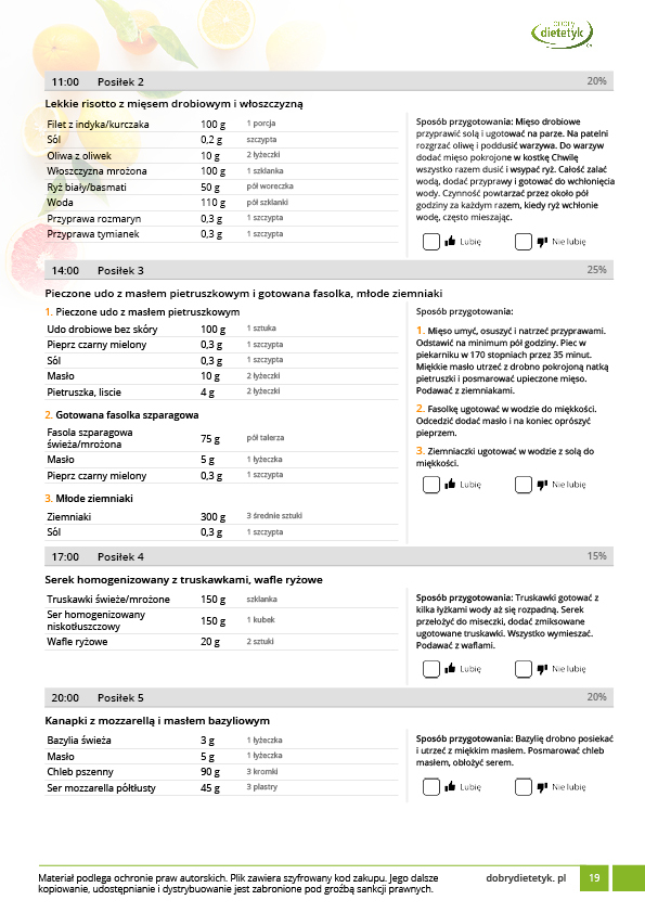 w formie propozycji posiłków (zamiast pojedynczych jadłospisów jednodniowych, przygotowano propozycje kilku propozycji dań na każdy posiłek). Tutaj nie uzależniamy Cię od tego jakie masz np. w danym dniu zjeść śniadanie czy obiad, tylko sam wybierasz sobie ulubione danie z kilku przedstawionych przez nas propozycji.